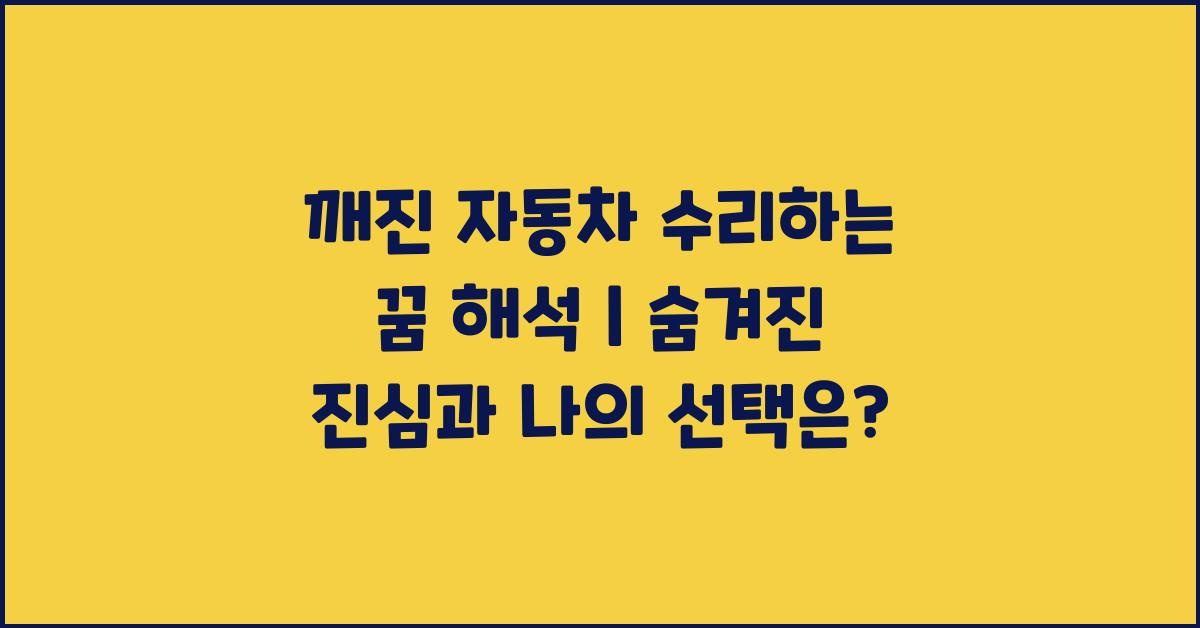 꿈은 종종 우리의 무의식이 드러나는 창구로 작용합니다. 특히 깨진 자동차 수리하는 꿈 해석은 우리 내면의 감정과 진심을 탐구하는 중요한 지침이 될 수 있습니다. 자동차는 일반적으로 우리의 삶을 상징하며, 그 상태는 우리의 정신적, 감정적, 혹은 물질적 상황을 반영합니다. 깨진 자동차는 여러 가지 의미를 가질 수 있으며, 각각의 경우에 따라 해석이 달라질 수 있습니다.