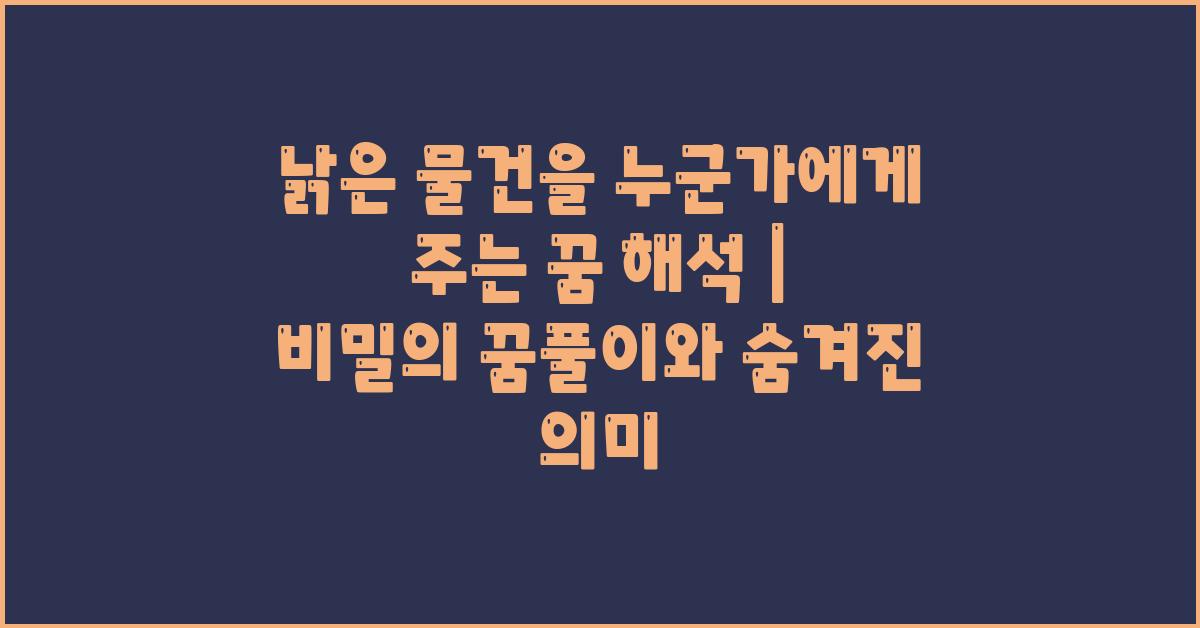 꿈은 우리의 무의식을 반영하며 다양한 심리적 상태와 감정을 나타냅니다. 꿈 해석은 단순한 상징적 표현 이상의 의미가 있습니다. 특히, 낡은 물건을 누군가에게 주는 꿈 해석 | 꿈해몽 꿈풀이 꿈해석 꿈의미는 과거의 추억이나 미련이 현재의 삶에 어떻게 영향을 미치는지를 보여줄 수 있습니다. 여러분은 이 꿈이 무엇을 의미하는지 궁금할 것입니다. 이처럼 꿈은 우리에게 중요한 메시지를 전달하려고 합니다.