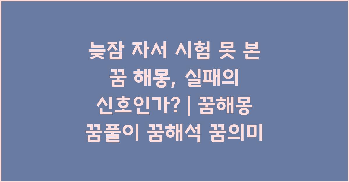 늦잠 자서 시험 못 본 꿈 해몽: 무의식의 경고? | 꿈해몽 꿈풀이 꿈해석 꿈의미라는 곰곰이 생각해 보아야 할 중요한 주제입니다. 이러한 꿈들은 우리 마음속에서 떠오르는 고민과 두려움을 상징적으로 표현할 뿐만 아니라 성장을 위한 단서이기도 합니다.