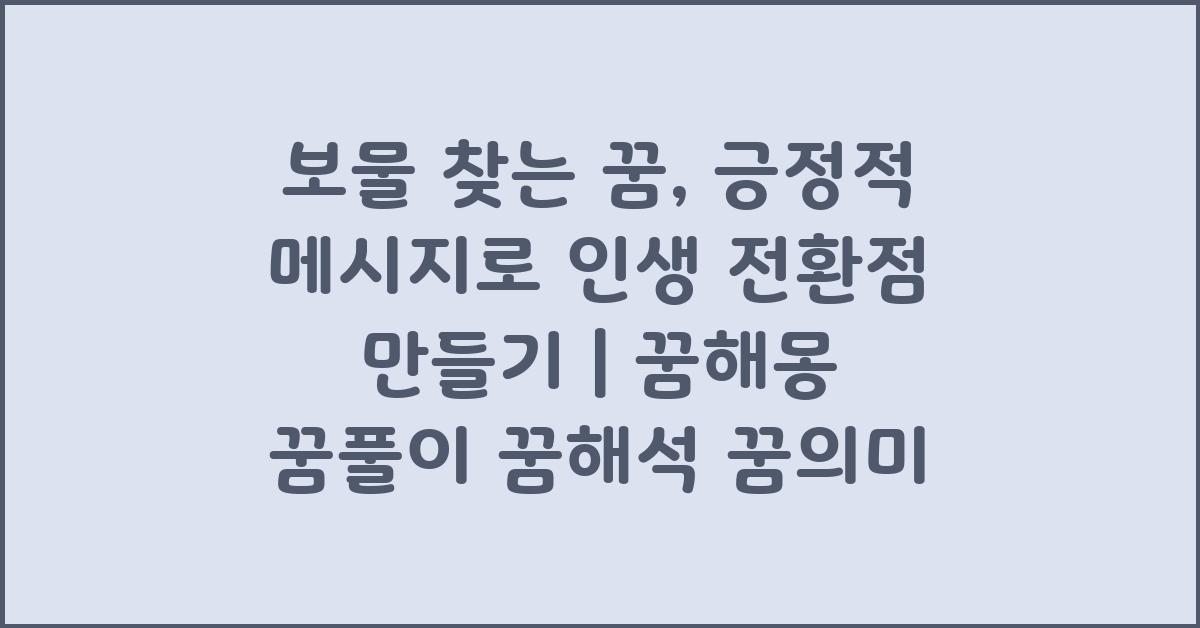 보물 찾는 꿈: 긍정적 메시지 | 꿈해몽 꿈풀이 꿈해석 꿈의미는 이런 특별한 경험을 통해 자신이 가진 잠재력을 깨닫고, 인생의 새로운 전환점을 상징합니다. 어떤 사람들에게는 그 의미가 사랑으로, 어떤 이들에게는 재정적 성공으로 다가올 수 있습니다. 그 꿈 속에서 내가 찾은 보물이 무엇인지 곰곰이 생각해보면, 내 삶의 현재 상태가 어떻게 변할 수 있을지에 대한 통찰을 얻게 됩니다.