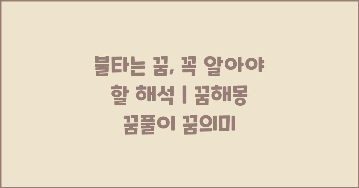 불타는 꿈은 다양한 해석 가능성을 지니고 있습니다. 예를 들어, 꿈에서 불이 나고 있는 상황을 보았다면, 이는 내면의 감정을 잘 전달하지 못하고 있다는 경고일 수 있습니다. 또한, 이러한 꿈은 종종 상실의 두려움이나 불안을 나타내기도 하고, 자신의 욕구를 충족시키지 못하는 상태에서 나타나기도 합니다. 불타는 꿈을 꾼 후에는 자신의 현재 정서와 삶의 상황을 되짚어 보는 것이 중요합니다.