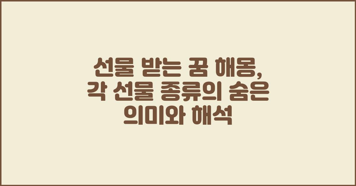 꿈에서 선물을 받는 것은 다양한 감정과 의미를 담고 있습니다. 각 선물의 종류에 따라 해석은 달라지며, 이를 통해 우리가 소중히 여기는 것, 원하는 것, 또는 두려운 것에 대해 깊이 생각하게 됩니다. 선물 받는 꿈 해몽: 꿈속 선물의 종류별 해석 | 꿈해몽 꿈풀이 꿈해석 꿈의미는 이 모든 통찰을 제공합니다. 꿈의 내용을 바탕으로 자신을 돌아보는 기회를 가져보세요.
