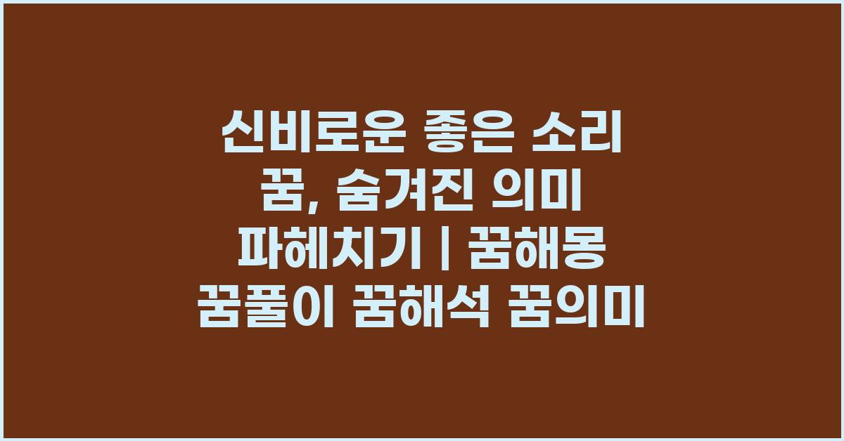 신비로운 좋은 소리 꿈은 여러 해석이 가능하지만, 그 소리의 종류와 꿈의 맥락에 따라 달라질 수 있습니다. 예를 들어, 자연의 소리, 음악, 혹은 사랑하는 사람의 목소리와 같은 소리들은 다양한 상징을 지닙니다. 이러한 소리가 꿈에서 나타날 때, 우리가 현재 직면하고 있는 상황에 대한 힌트를 제공해줄 수 있습니다. 신비로운 좋은 소리 꿈, 그 숨겨진 의미 | 꿈해몽 꿈풀이 꿈해석 꿈의미에서는 이러한 다양한 해석을 통해 소리의 배경과 연관된 감정을 살펴볼 수 있습니다.
