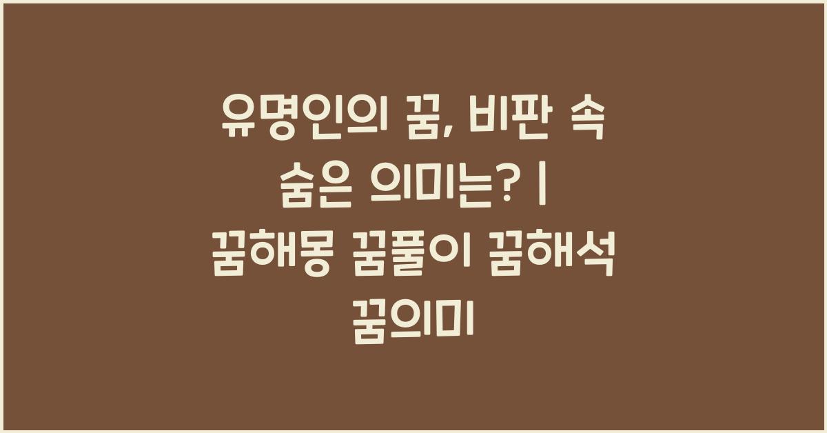사람들은 꿈에 대해 많은 이야기를 나누고 있습니다. 특히 유명인이 꿈을 꿨다면, 그 꿈은 더욱 많은 주목을 받게 되죠. 오늘은 '유명인의 꿈, 칭찬 대신 비판을 받았다면? | 꿈해몽 꿈풀이 꿈해석 꿈의미'라는 주제를 가지고, 그런 꿈이 가진 다층적인 의미에 대해 탐구해보겠습니다.