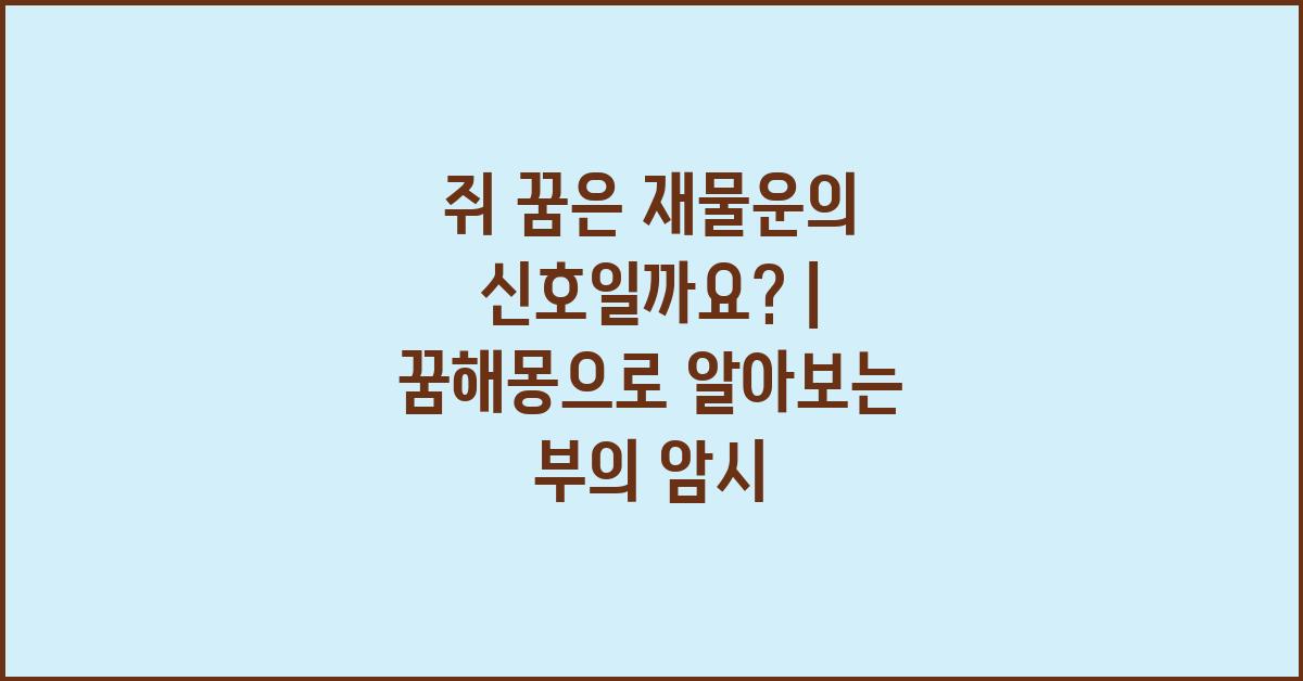 우리가 자는 동안 펼쳐지는 꿈의 세계는 신비롭고 깊이 있는 의미를 내포하고 있습니다. 특히 쥐 꿈은 많은 사람들에게 인지되는 상징적인 메시지를 가지고 있습니다. 사실 쥐는 전통적으로 부와 풍요를 상징한다고 여겨지기도 하며, 이로 인해 '쥐 꿈은 재물운의 신호일까요? | 꿈해몽 꿈풀이 꿈해석 꿈의미'라는 질문을 싹트게 합니다. 구체적으로, 쥐가 등장하는 꿈이 재물이나 희망적인 이벤트와 어떻게 연결될 수 있는지 알아보는 것이 중요합니다.