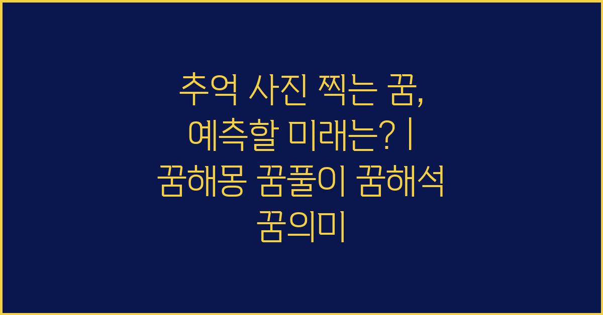 꿈은 우리의 무의식 속에 숨겨진 메시지를 전달하는 독특한 창구입니다. 특히 추억 사진 찍는 꿈, 미래를 예측할 수 있을까? | 꿈해몽 꿈풀이 꿈해석 꿈의미와 같은 꿈은 과거의 소중한 기억을 상기시킬 뿐만 아니라 미래에 대한 암시를 주는 경우도 있습니다. 꿈 속에서 찍은 사진은 과거의 순간을 집중적으로 보여주며, 이는 우리의 정신적 성장을 나타내기도 하지요. 제가 어릴 적에 찍었던 사진들이 늘 제 꿈 속에 나타나곤 했습니다. 그냥 웃고 있는 모습들인데, 가끔은 그 순간들이 얼마나 소중했는지 깨닫게 되곤 했죠.
