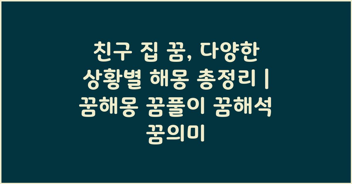 꿈은 우리의 무의식적인 생각과 감정이 비치는 창처럼 작용할 수 있습니다. 특히 친구 집 꿈은 여러 의미를 담고 있으며, 다양한 상황에 따라 해몽이 달라질 수 있습니다. 오늘은 친구 집 꿈, 상황별 해몽 총정리 | 꿈해몽 꿈풀이 꿈해석 꿈의미를 통해 이 꿈이 특히 어떤 의미를 지니는지 알아보겠습니다. 우리가 경험하는 꿈속의 친구 집은 단순한 장소 이상의 의미를 담고 있을 수 있으므로, 잘 살펴봐야 합니다.
