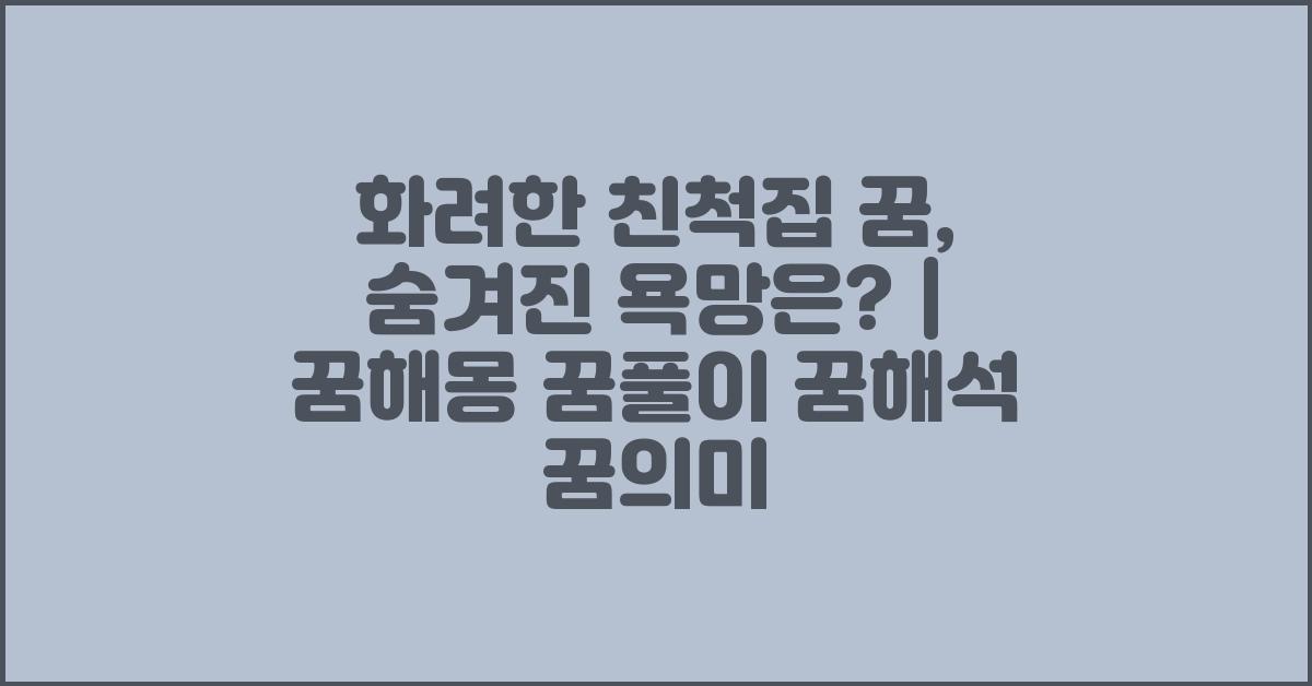 오늘은 밤하늘을 가로막는 별빛처럼 눈부신 꿈의 세계, 특히 화려한 친척집 꿈, 당신의 욕망은? | 꿈해몽 꿈풀이 꿈해석 꿈의미에 대해 이야기해보려고 합니다. 꿈속에서 친척의 집은 항상 그 집의 특색과 함께 우리 내면의 모습을 드러낼 수 있는 중요한 상징입니다. 아마 여러분도 그렇게 느껴본 적이 있을 것입니다. 어렸을 적 함께 뛰놀던 친척 집, 혹은 소중한 추억이 가득한 그곳의 꿈을 꾸게 된다면 그 의미가 무엇일까요?